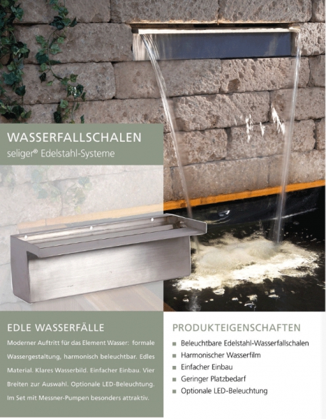 In drei unterschiedlichen Breiten fällt das Wasser aus den Edelstahl-Wasserfallschalen. Im Anstaukasten wird das Wasser zunächst durch integrierte Lamellen beruhigt und läuft dann über die Ablaufkante, die einen klar akzentuierten Wasserfilm formt.