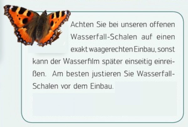 Wasserfallschale inkl. Vorbereitung für LED-Leiste, Schlauchtülle 1", Befestigungsset, Blindstopfen |