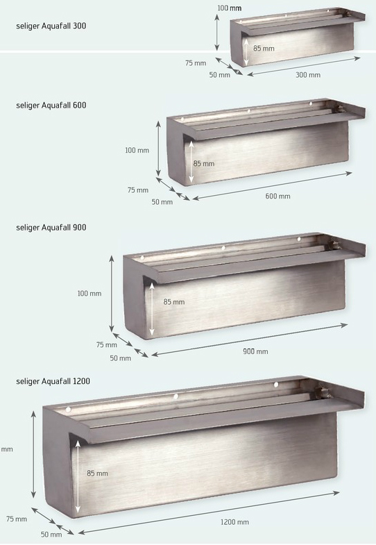 Die Wasserfallschalen Aquafall 300 - 900 lassen sich mit LED-Leisten kombinieren. In den Anstaukasten eingebaut, illuminiert die Leiste den Wasserfilm von innen.