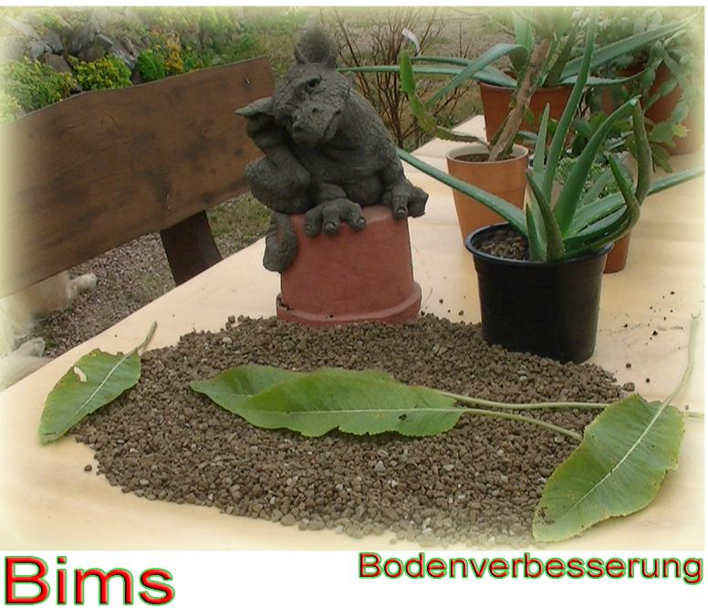 Bims kann zur Verbesserung von Böden genutzt werden. So ist er rein mineralisch und hat die Eigenschaft viel Wasser speichern zu können oder durch seine porige Struktur den Luftgehalt zu verbessern. Die Wurzelentwicklung wird durch Bims gefördert.