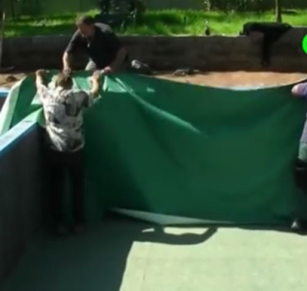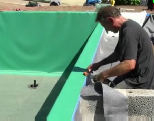 Die Teichfolie Schwimmbadfolie oder Dachfolie werden auf der hellgrauen Oberseite des Verbundbleches mittels Heißluft oder Quellschweißverfahren homogen miteinander verbunden.