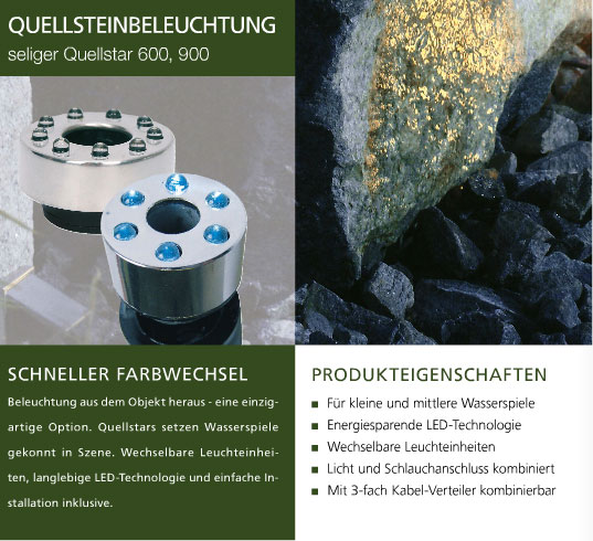 LED in der Beleuchtungstechnik zeichnet sich durch energiesparenden und zuverlässigen Betrieb aus. Die im Quellstarintegrierten LED-Leuchten lassen bei sehr geringem Stromverbrauch (von nur 0,1 W), je eingesetzter LED, das heraussprudelnde Wasser erstrahlen. Praktisch ist auch die Sensor-Abschaltautomatik, durch die sich der Quellstar bei zu starker Lichteinwirkung automatisch abschaltet.